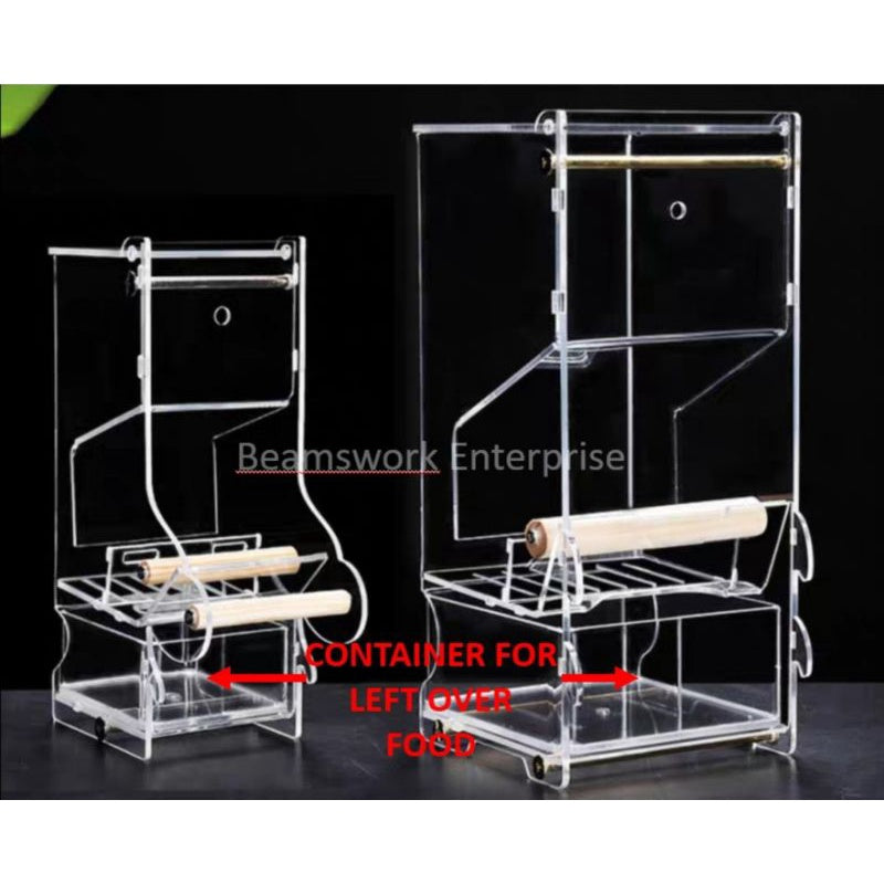 New Bird auto feeder. Food seed are dispense into the bottom container. Parrot food dispenser. Come in 2 sizes.