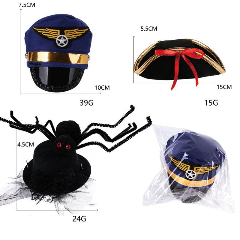 Item No.: PU014 Product Category: Pet Accessories Pattern: Cartoon Size: Black Hat, Sailor, Captain, Pilot, Spider, Pirate Material: Polyester Style: Denim Applicable object: general Applicable season: general Function: Dress up Features: Comfortable and Durable Material, Easy to Clean, Breathable and not stuffy Note: The manually measured size may be wrong, please don’t mind