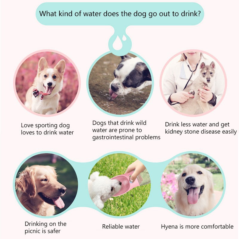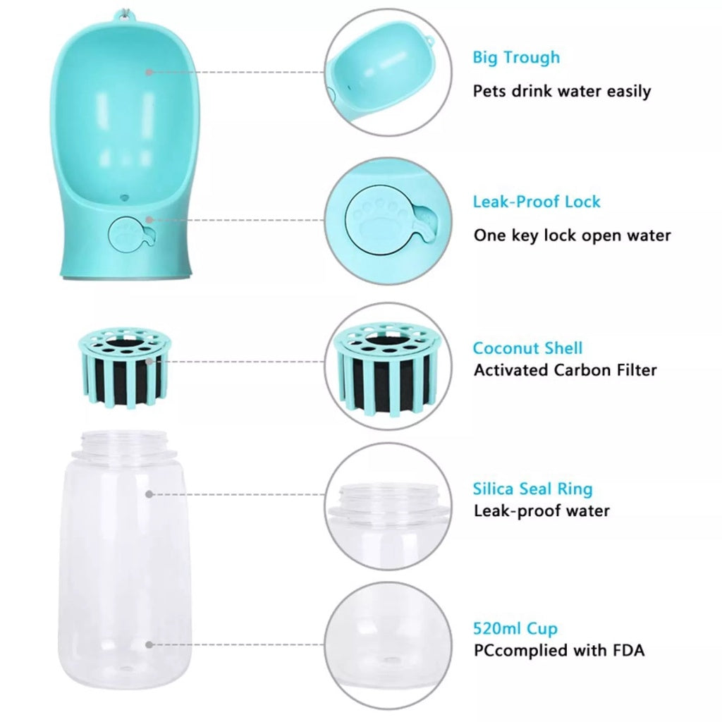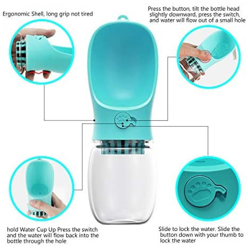 Worried about your dog getting thirsty during outdoor activities? Our Pet's Water Bottle keeps your dog hydrated while on-the-go. The bottle dispenses water into the attached mini bowl with the touch of a button and sucks unfinished water back into the bottle. Super convenient and practical for any outdoor and everyday use! Size: 350ml / 550ml Features & Benefits: QUICK & CONVENIENT: All you have to do is fill the water bottle before going out with your dog, unlock the nozzle with the easy unlock button when your dog is thirsty, and hold down the dispense button giving your dog access to the water it needs SAVE WATER: Simply press the dispense button while holding the bottle upright and the water goes back into the bottle. This way, your dog will always have enough water! LEAK-PROOF DESIGN - one-key lock water and sealing rubber ring effectively prevent water leaking. Never worry about your bag getting wet ever again! EXTREMELY PORTABLE: Its compact form allows the bottle to fit anywhere whether it's your backpack, duffel bag, or anywhere else! Includes an easy to install wrist strap that will allow you to carry around the bottle without worrying about holding it! HIGH- GRADE MATERIALS - High-quality antibacterial food grade ABS material, FDA approved, lead-free and BPA-free